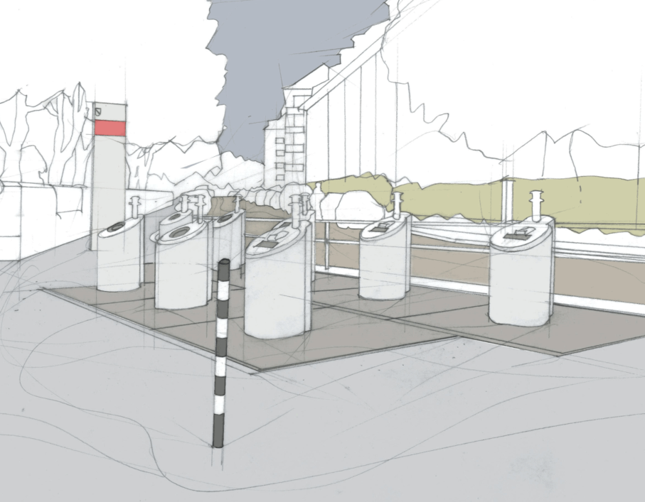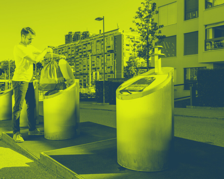 Bei grösseren Überbauungen ab ca. 100 Wohnungen empfehlen wir, eine sogenannte Unterfluranlage einzurichten. Diese können alle Wohnparteien der Siedlung nutzen. Klären Sie den Standort der Sammelstelle vorzeitig mit Entsorgung + Recycling ab. Die Stadt Bern beteiligt sich finanziell am Bau privater Sammelstellen mit Unterflur-Behältern.